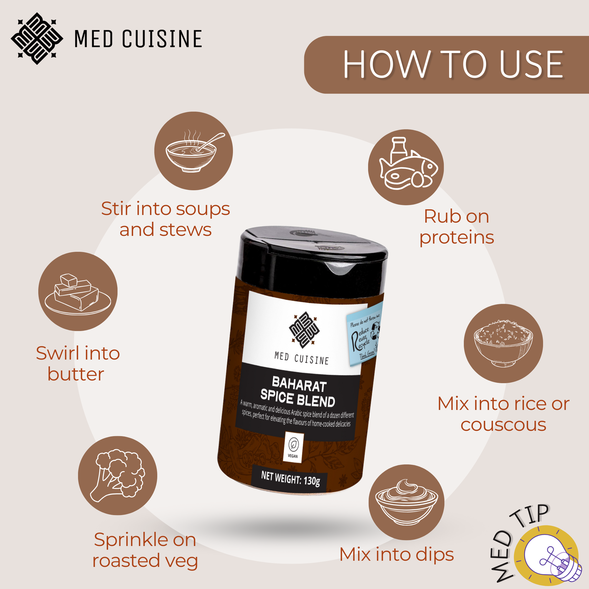 When you think of Middle Eastern and Mediterranean cuisine, your senses tingle with anticipation of the glorious blends of herbs and spices that create their inimitable taste. Med Cuisine proudly offers an ever-growing collection of spice blends, from popular favourites to niche specialties. Elevate your culinary adventures with these fantastic, deep flavors that echo the incredible histories inspiring each dish.