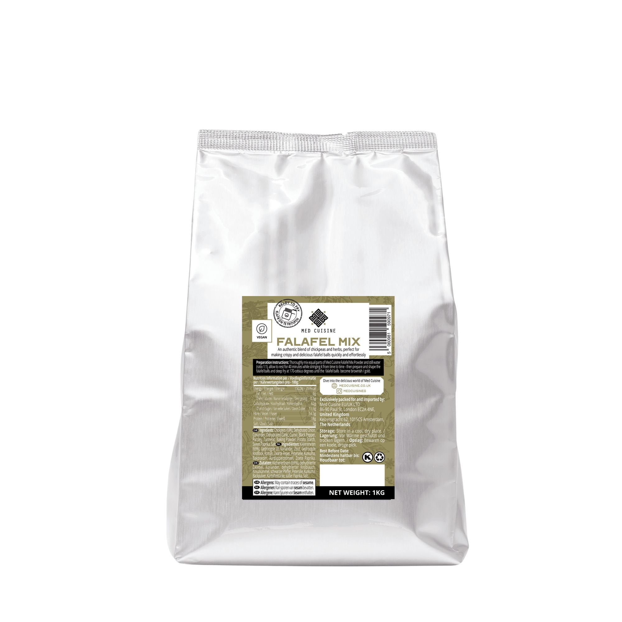 Thoroughly mix equal parts of Med Cuisine Falafel Mix powder and still water (ratio 1:1), allow to rest for 40 minutes while stirring it from time to time - then prepare and shape the falafel balls and deep fry at 170 °C until the falafel balls become brownish / gold.